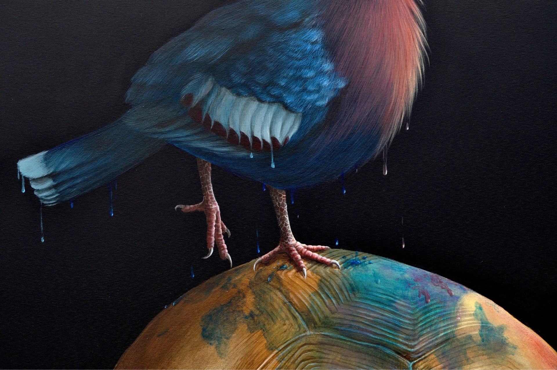 Sul suo carapace ho rappresentato la Goura Victoria, un columbide della Nuova Guinea che, con la sua cresta con rari ciuffi bianchi (come i ghiacciai) e il suo azzurro, blu e rosso porpora rappresenta gli oceani, ormai inquinati. Così sciogliendosi trasforma il guscio della tartaruga nel nostro pianeta , un pianeta pronto ad affondare con i suoi continenti ormai secchi come deserti.